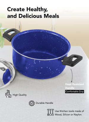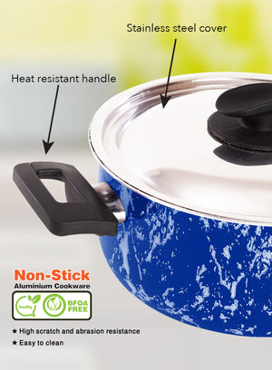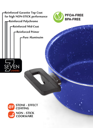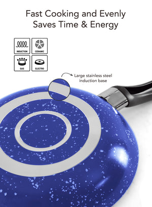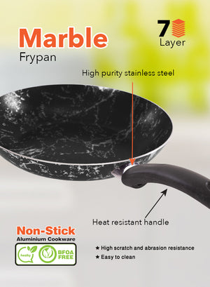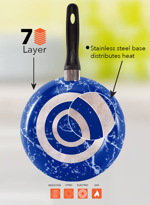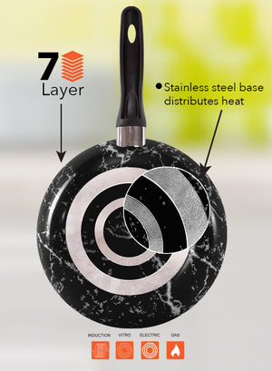 Marble offers a high-quality non-stick coating, that ensures the best cooking experience every time: perfect dishes and easy cleaning. The polished bottom is ideal for every kind of cook hob (induction excluded) and makes the product non-slip and extremely reliable. The ergonomic handles guarantee a safe and comfortable grip. Italian 7 layer coating Non-sticking surface, dont use metal utensils